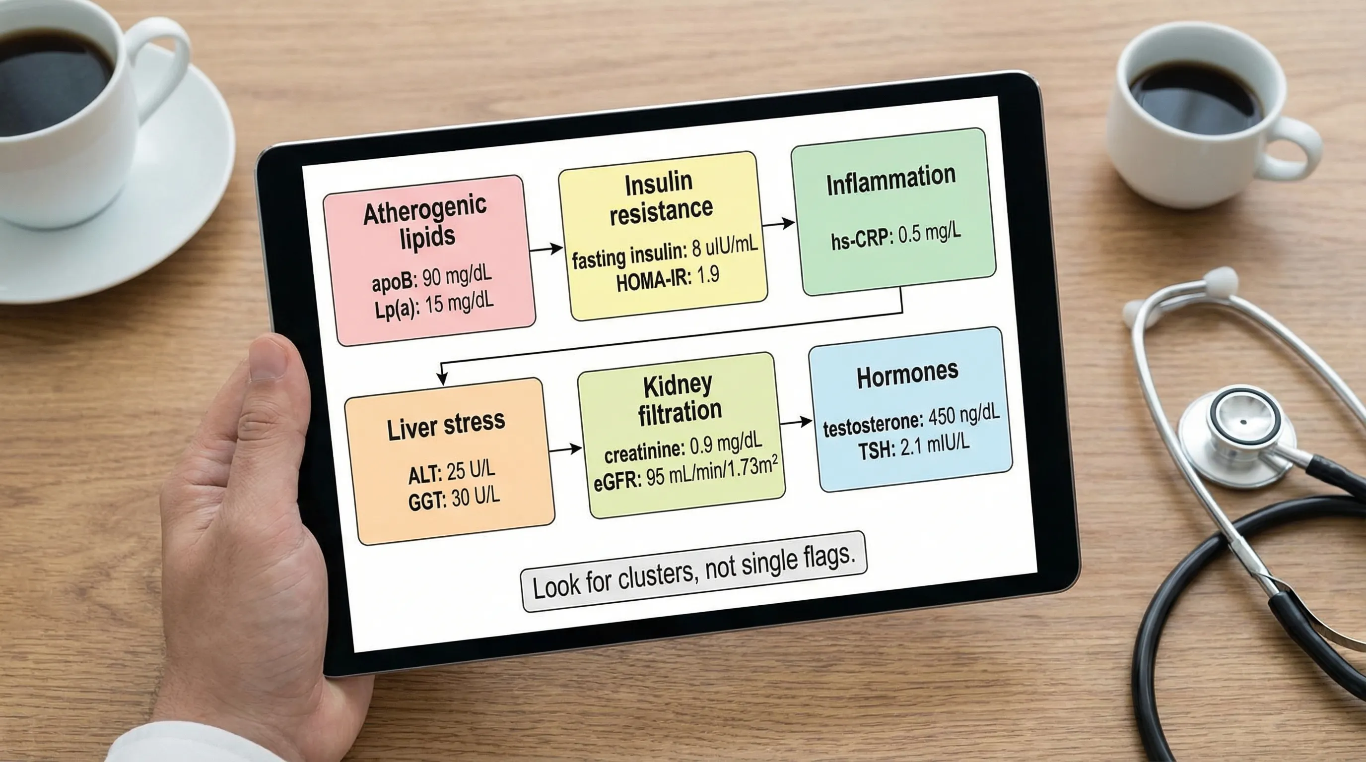 Clinicians do something different. They look for patterns across related biomarkers that point to a system-level story: cardiometabolic risk, inflammation, liver stress, kidney filtration, nutrient status, or hormone signaling.